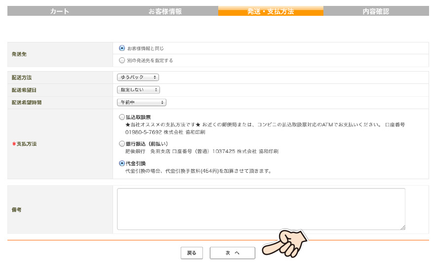 3. 商品の合計額を確認してください。発注したい場合は、「次へ」